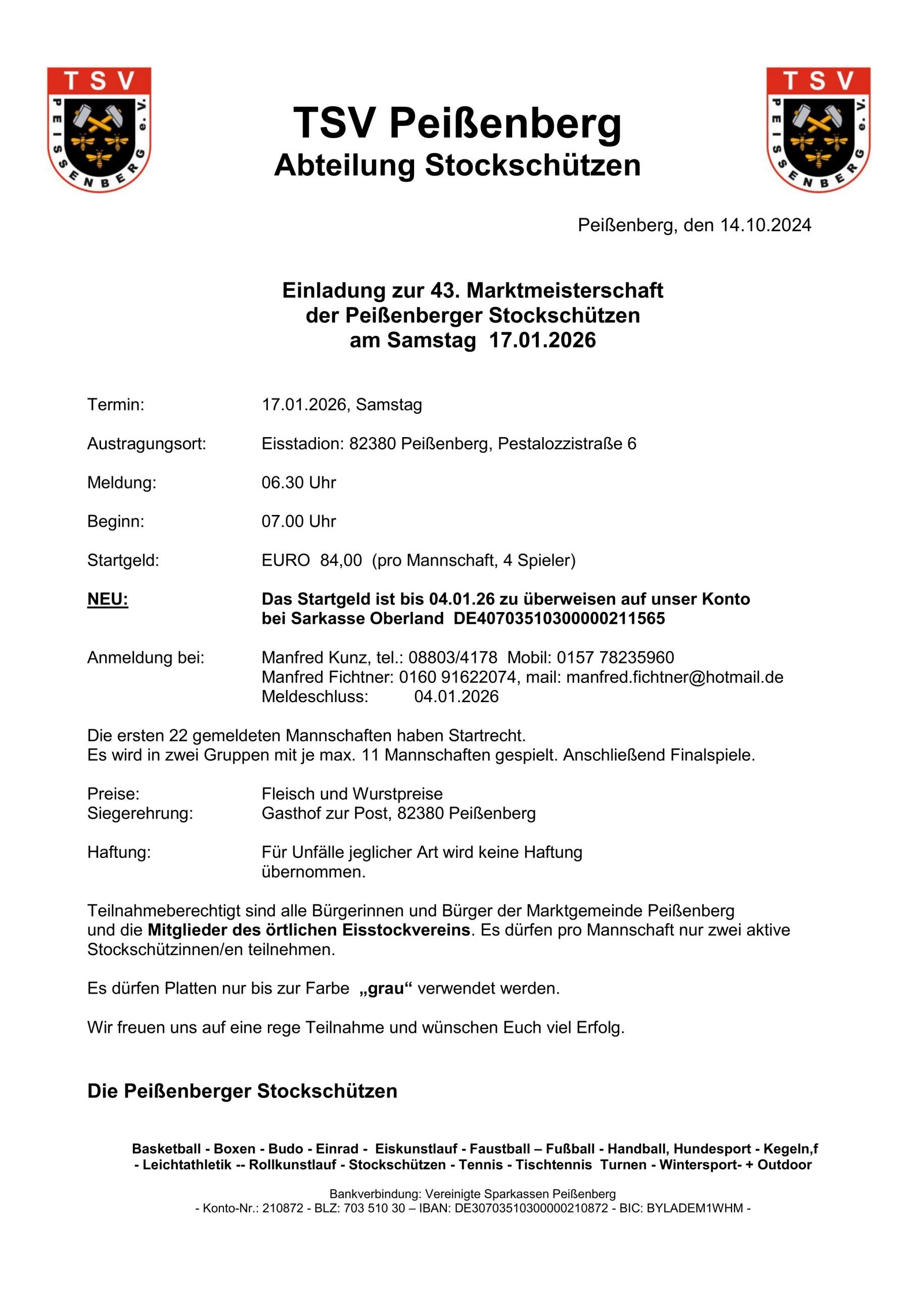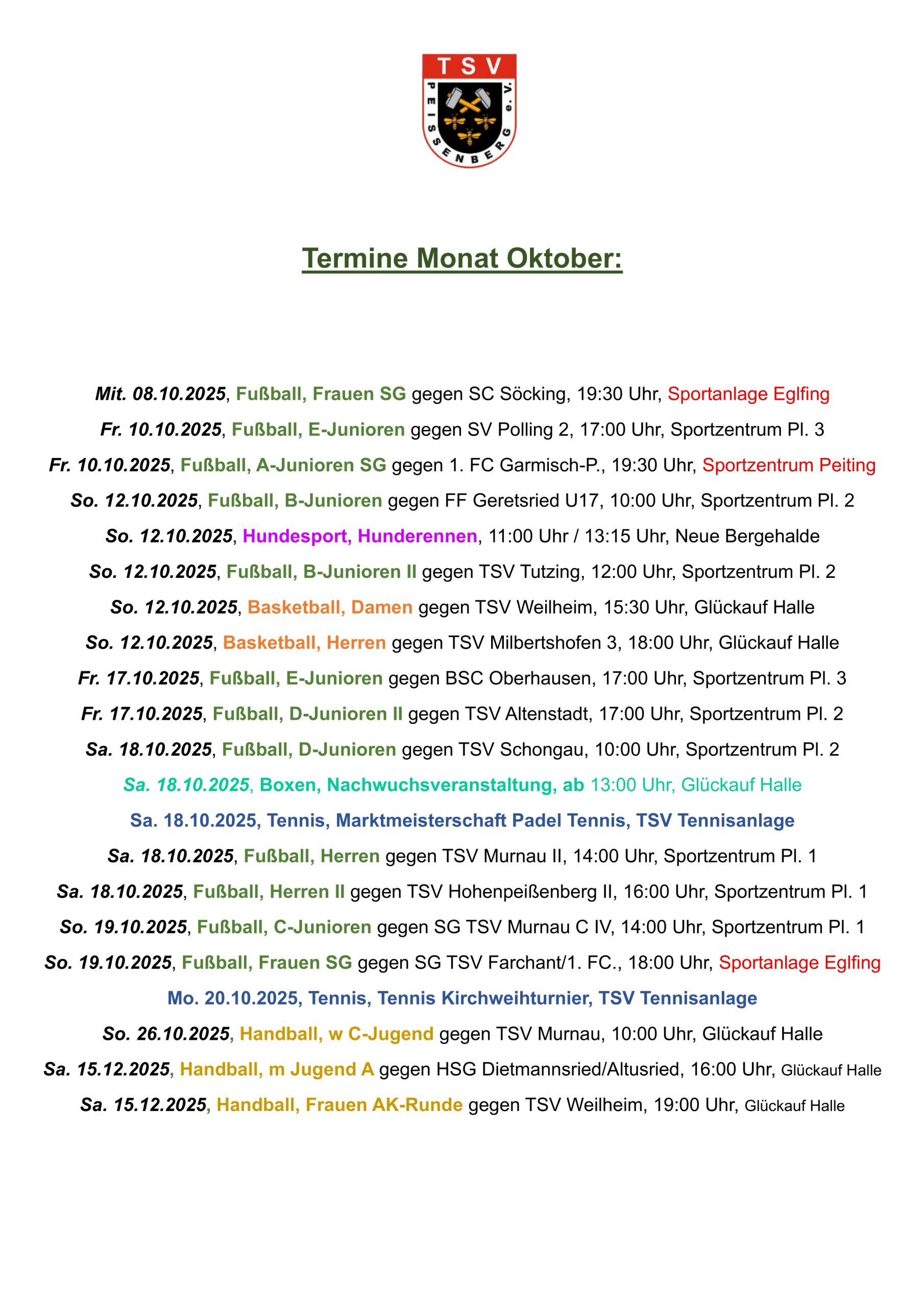 27.09.2025, Abteilung Kegeln, Ergebnis vom zweiten Spieltag 1. Mannschaft: SpG Tölz / Wackersberg G1 : TSV Peißenberg G1, 5:1 mit 1916:1884 Holz 2. Mannschaft Schwarz-Gelb Schongau G4 : TSV Peißenberg G2, 5:1 mit 1853:1750 Holz […]